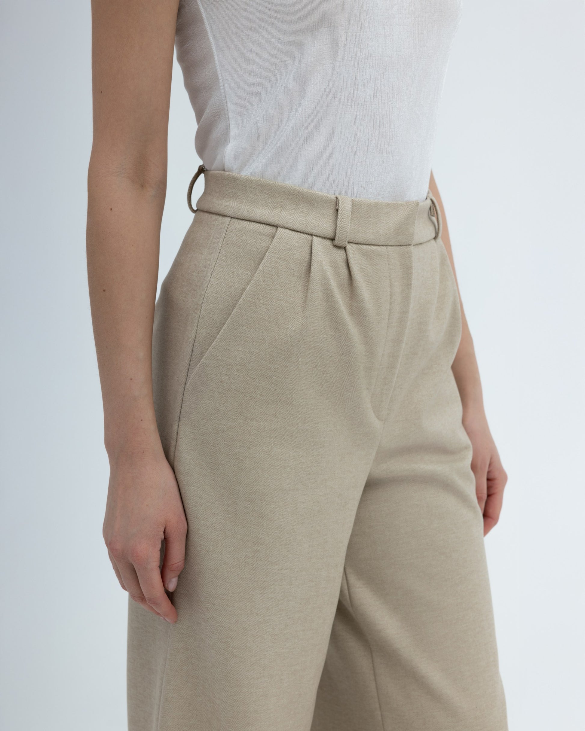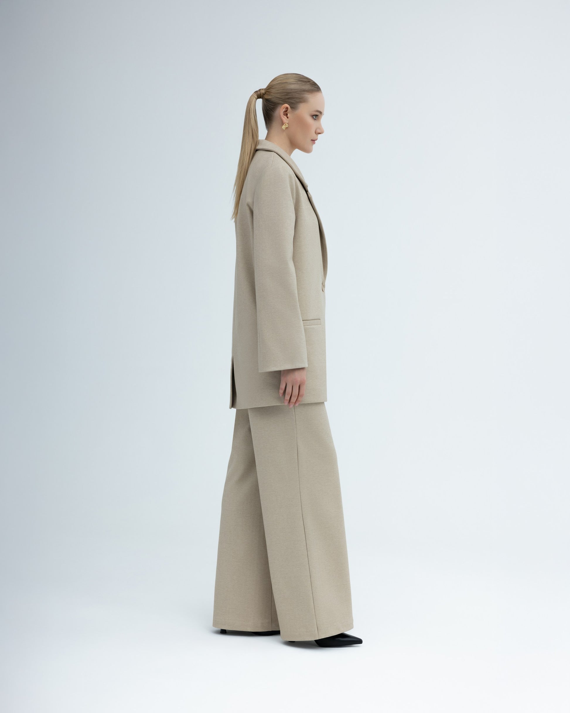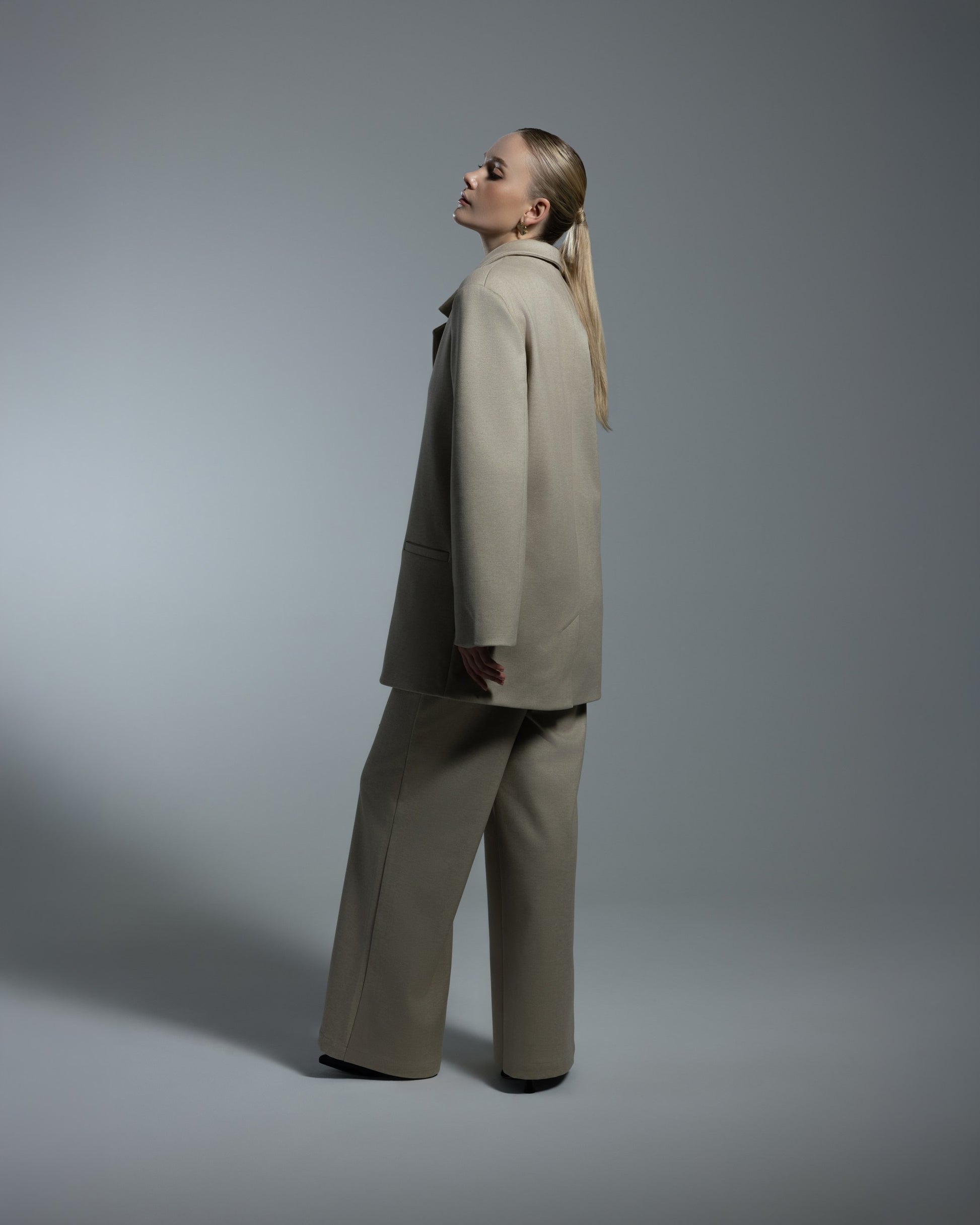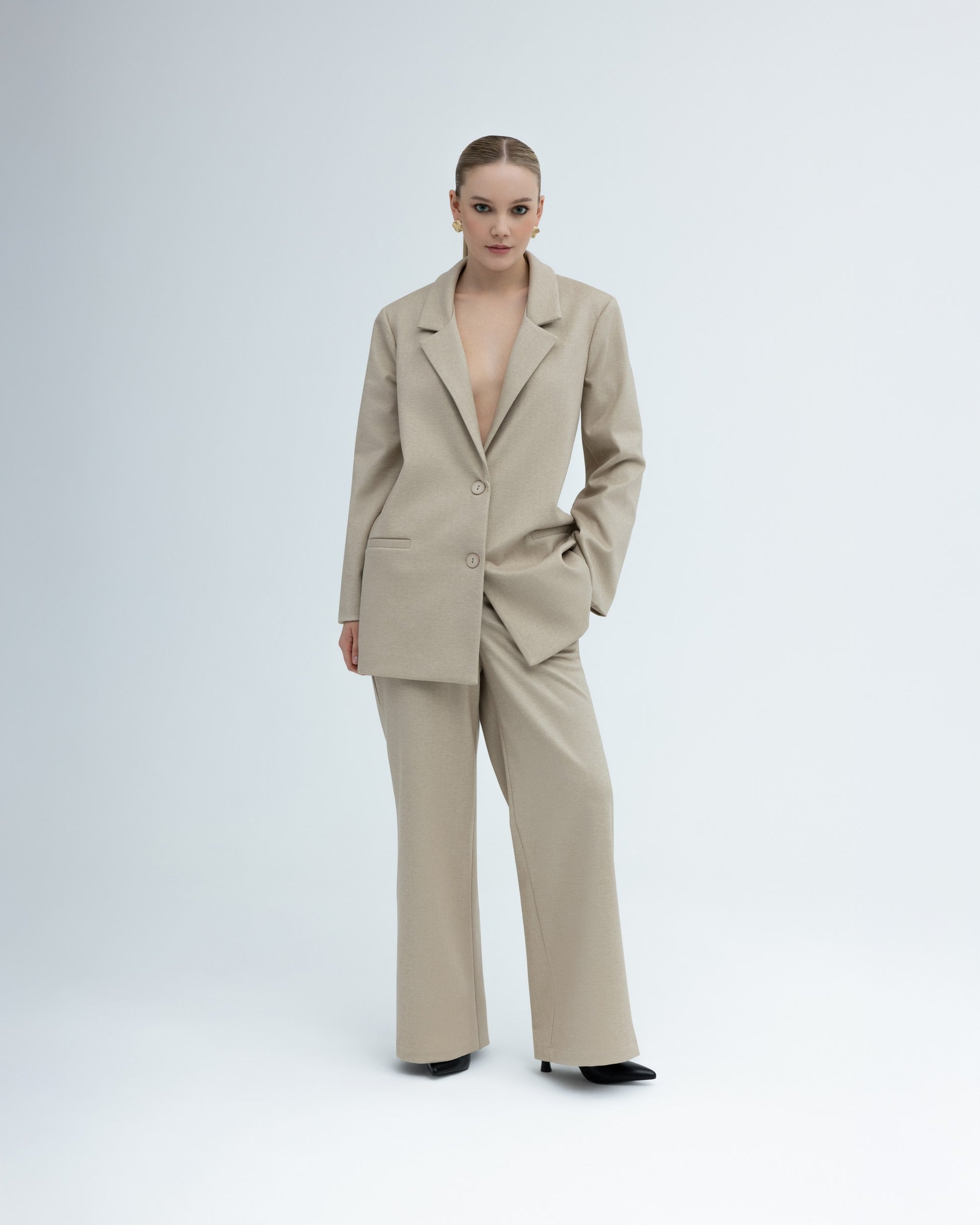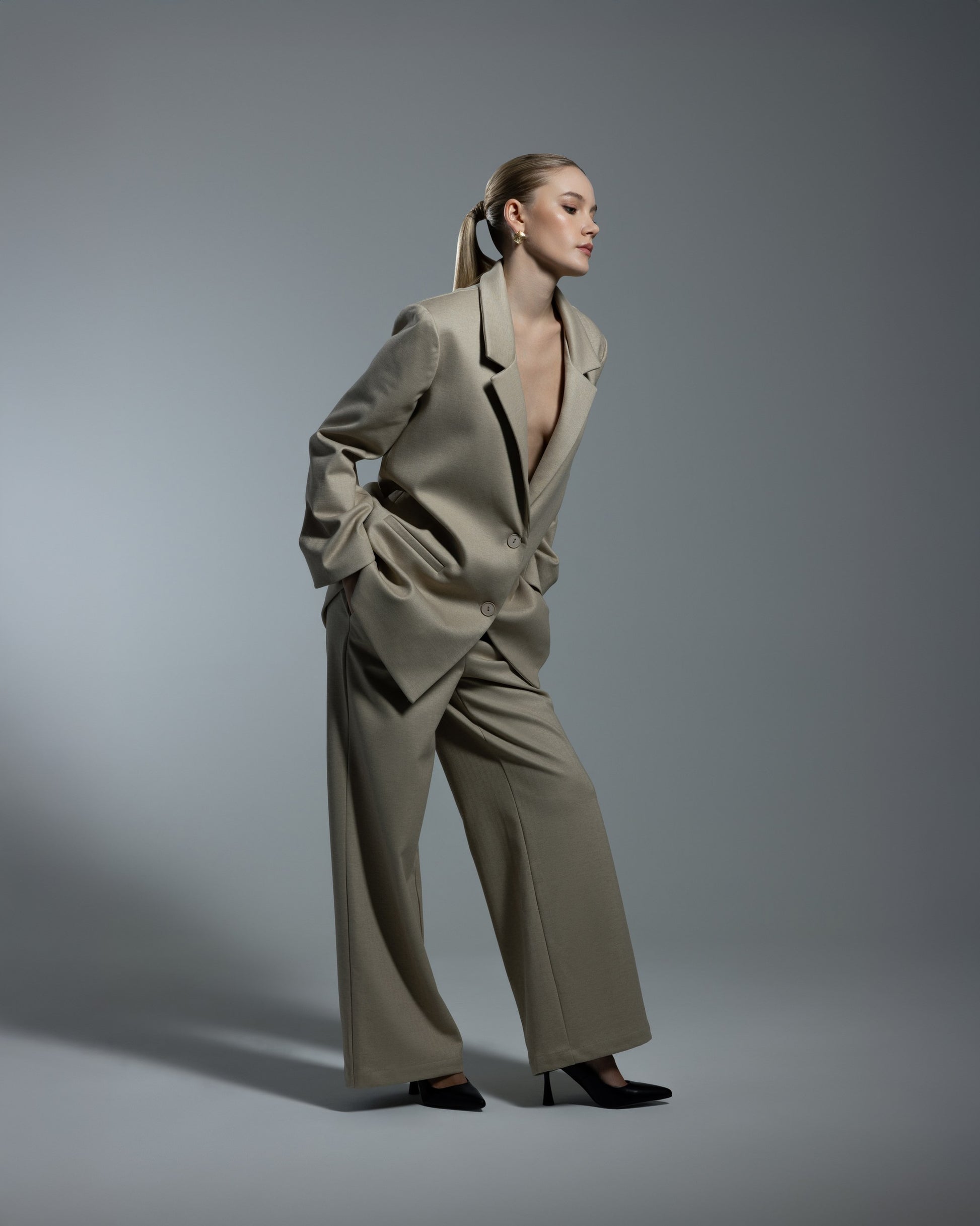 A timeless classic reimagined with modern elegance. The “Dune” suit by VOIX DE CHIC features a structured oversized blazer and high-waisted tailored trousers in a warm sand beige — designed to empower without trying too hard.