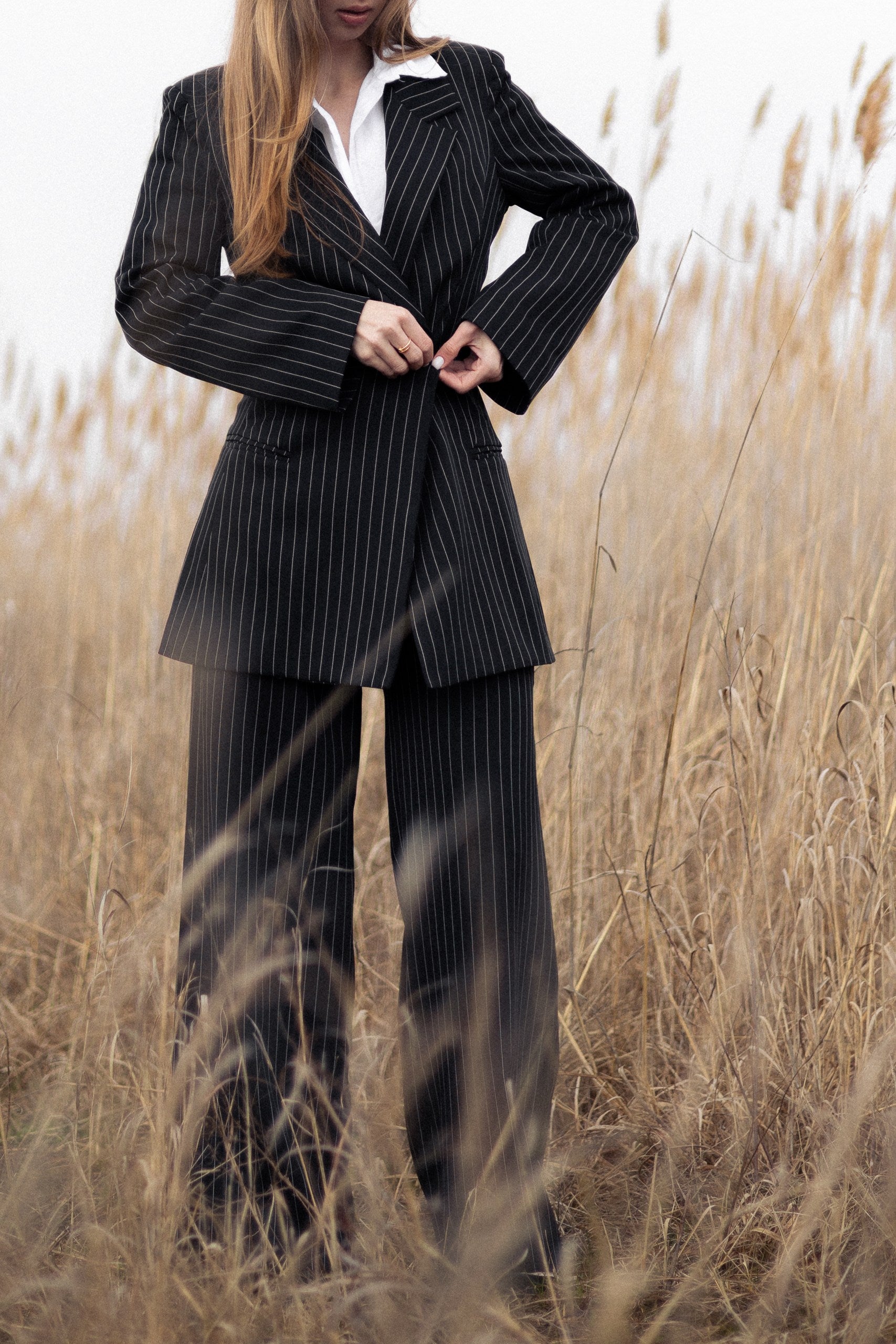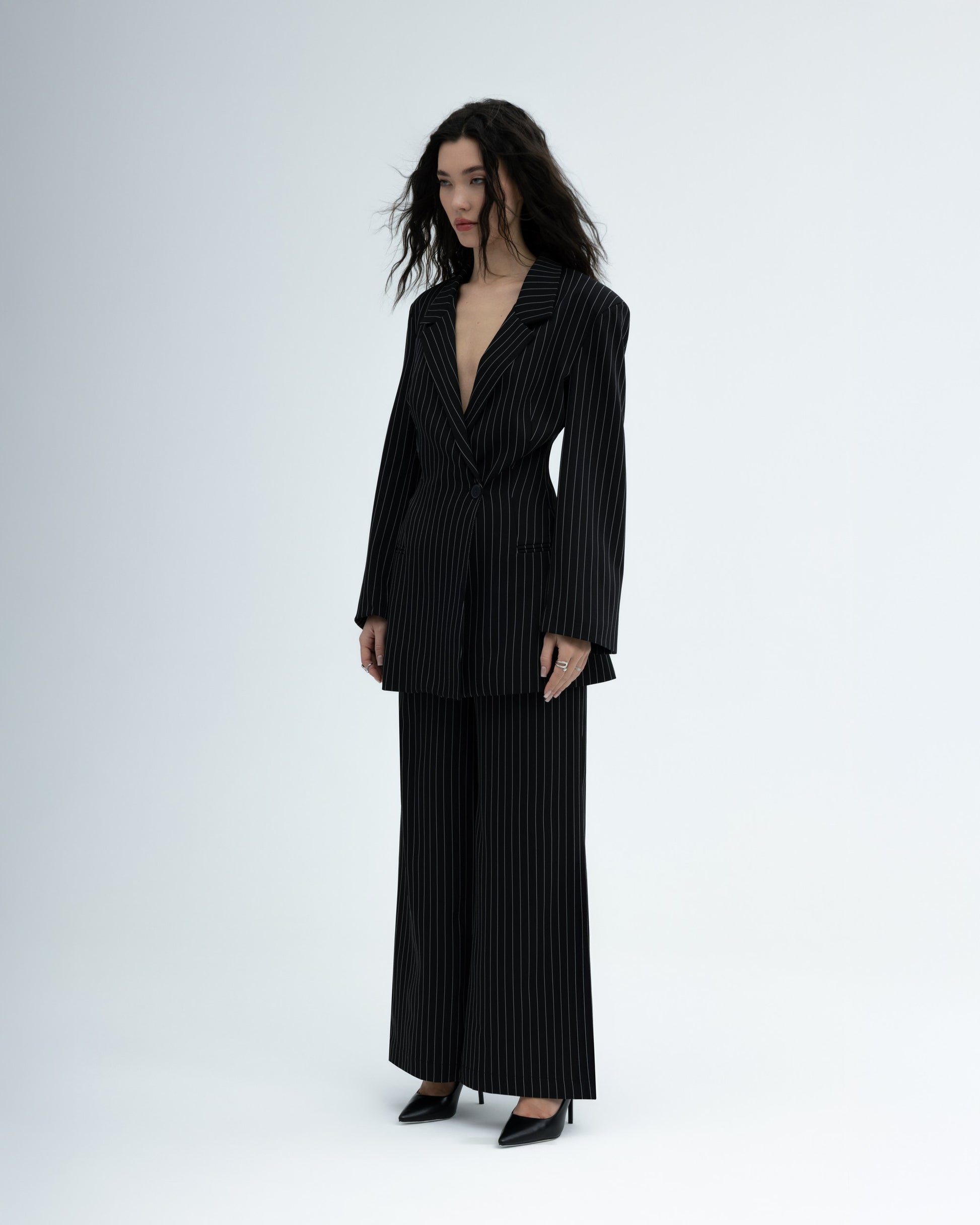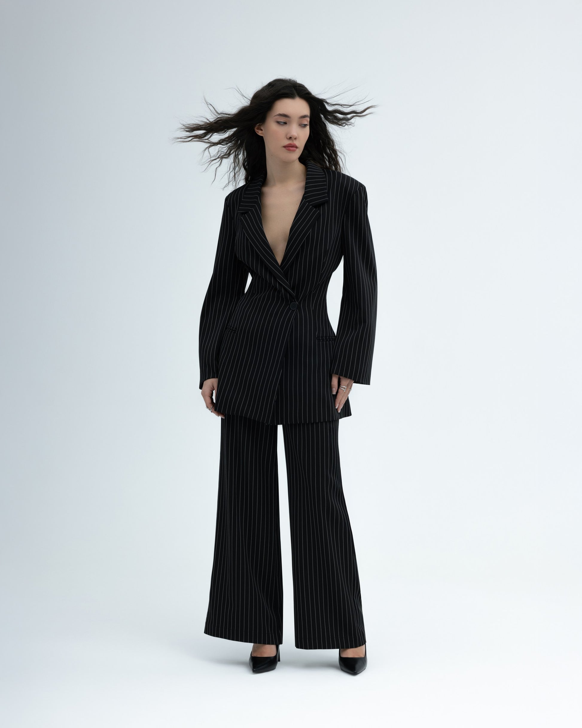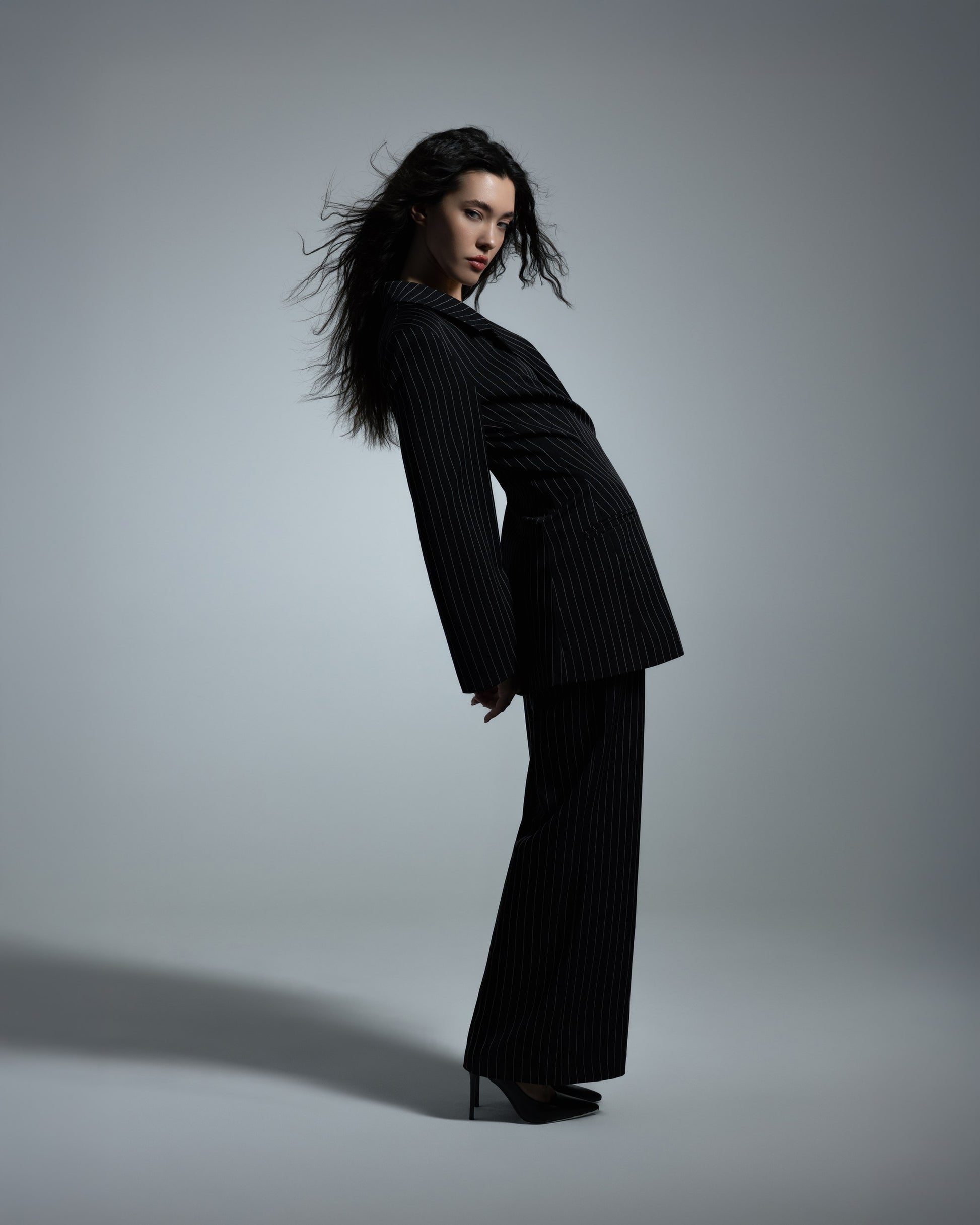 The “Signature Set No.2 — Black Pinstripe” suit by VOIX DE CHIC is crafted for women who command through presence, not volume. With its sculpted blazer and elongated high-rise trousers in classic black pinstripe, it merges masculine discipline with feminine poise — tailored for clarity, not compromise.