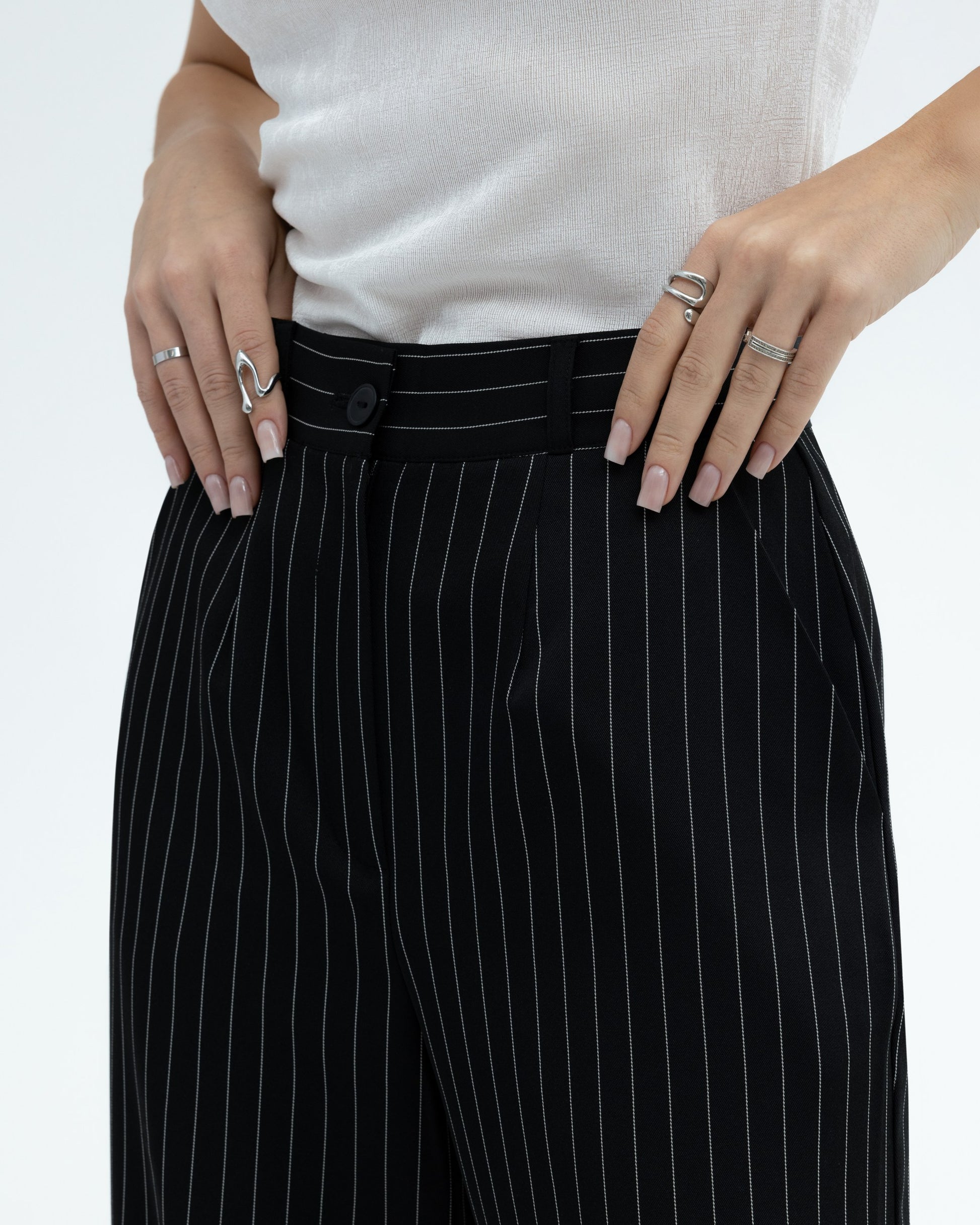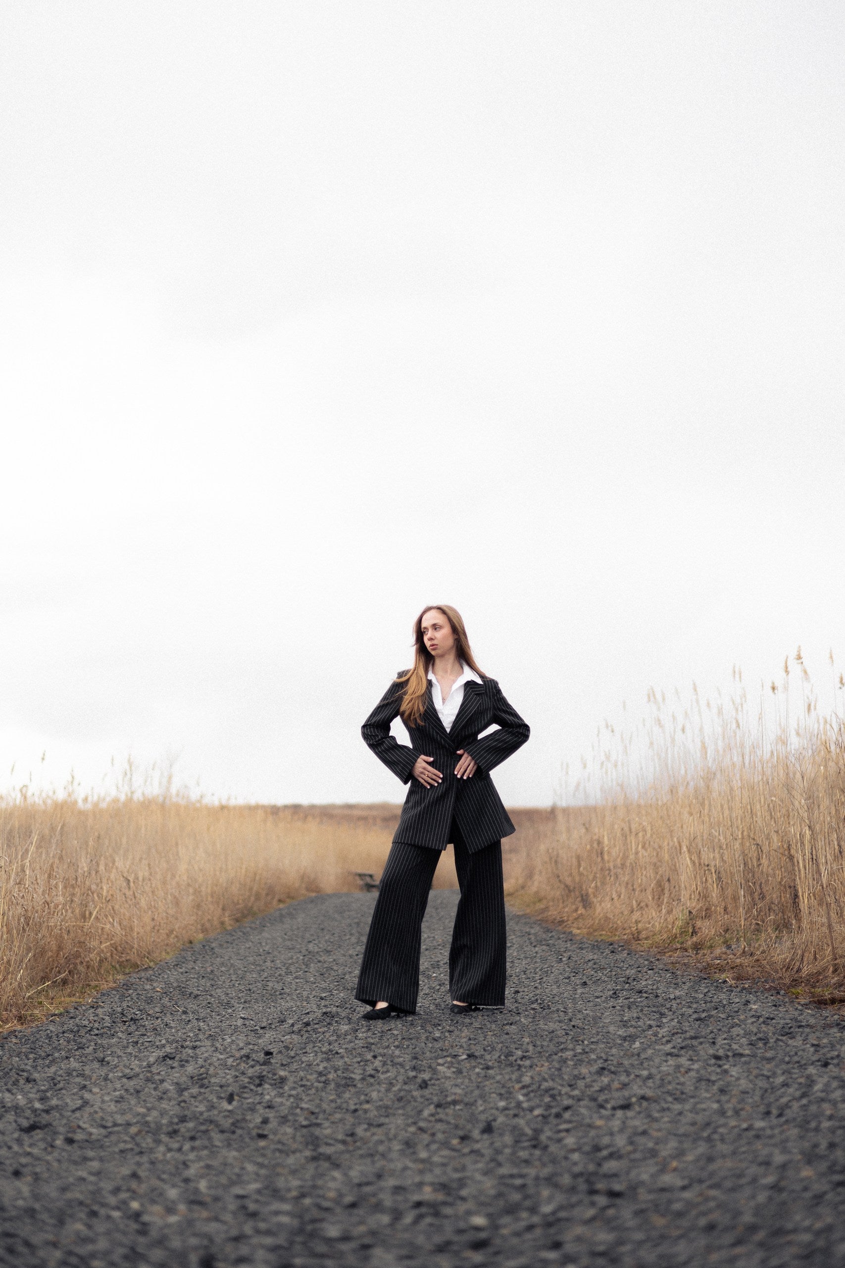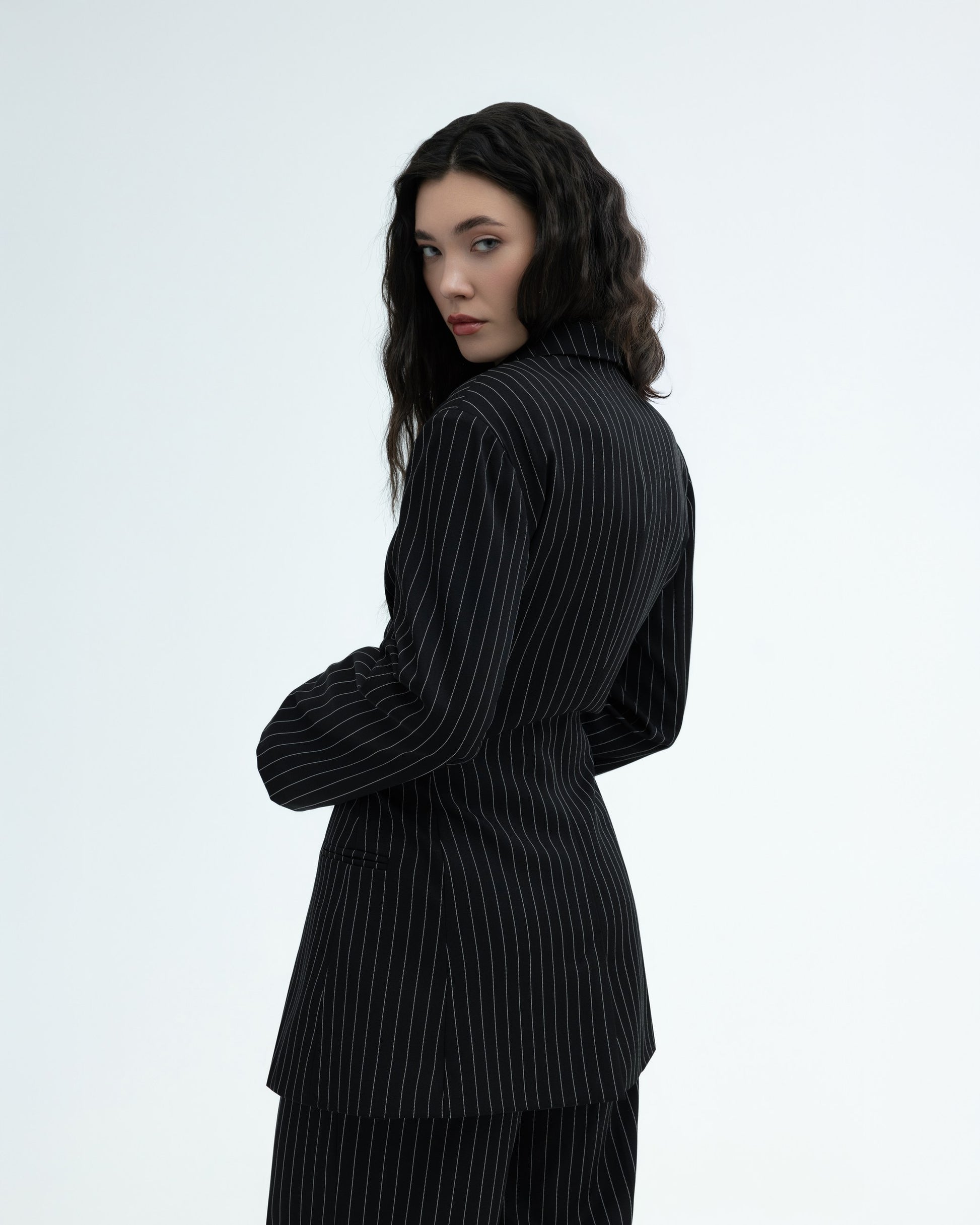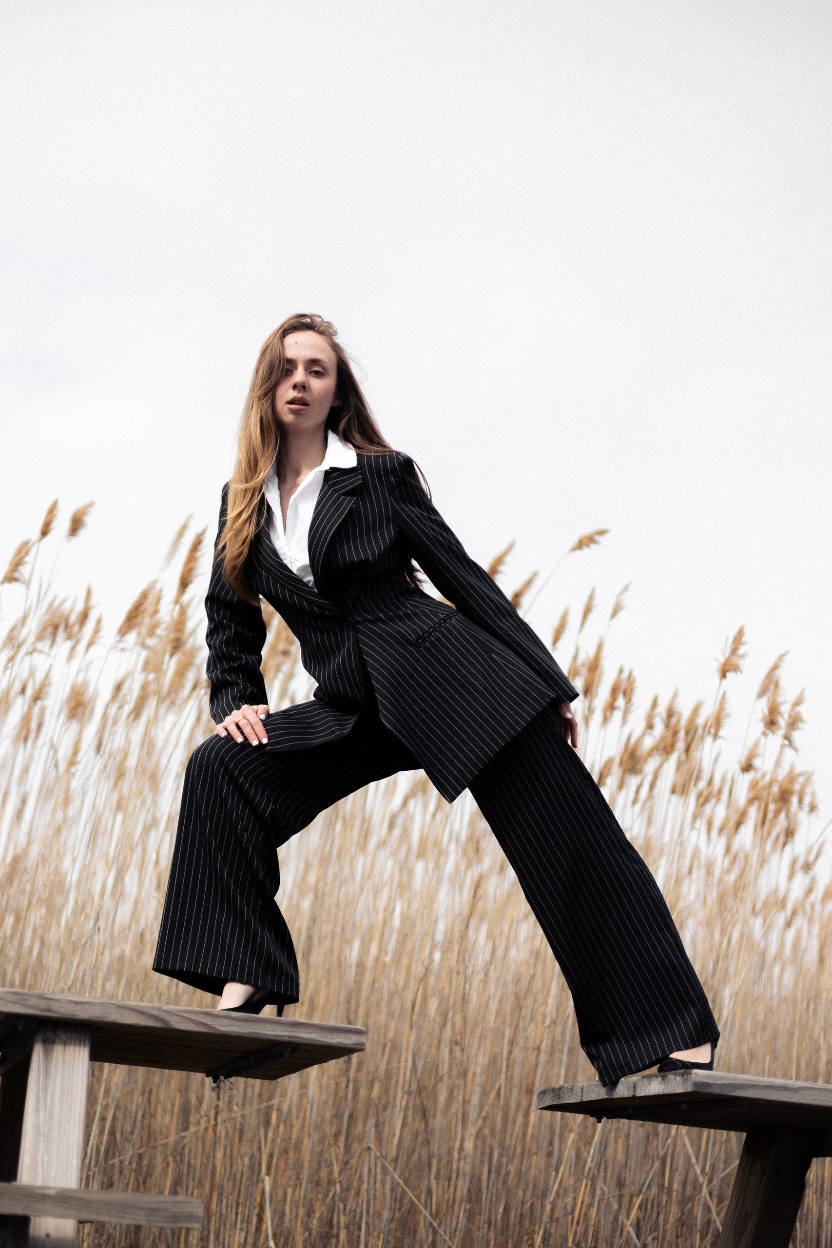 The “Signature Set No.2 — Black Pinstripe” suit by VOIX DE CHIC is crafted for women who command through presence, not volume. With its sculpted blazer and elongated high-rise trousers in classic black pinstripe, it merges masculine discipline with feminine poise — tailored for clarity, not compromise.